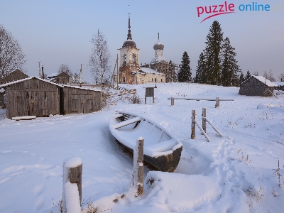 Kaplica, Drzewa, Kienozierski Park Narodowy, Cerkiew, Rosja, Zima, Obwód archangielski, Ogrodzenie, Zniszczona, Łódka, Miejscowość Lyokshmozero