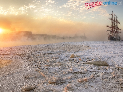 Śnieg, Żaglowiec, Zima, Rzeka, Wschód słońca