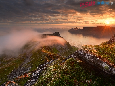 Góry, Wyspa Senja, Skały, Roślinność, Mgła, Morze, Norwegia, Góra Husfjellet, Wschód słońca