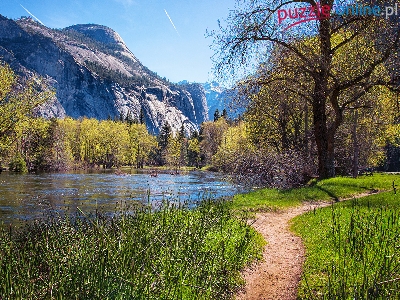 Drzewa, Góry, Wiosna, Rzeka Merced River, Stany Zjednoczone, Trawa, Park Narodowy Yosemite, Ścieżka, Kalifornia