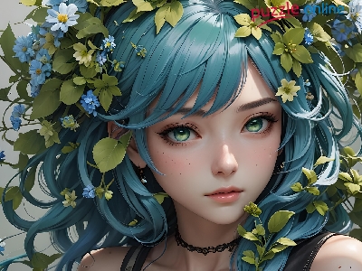 Liście, Dziewczyna, Oczy, Anime, Włosy, Niebieskie, Kwiaty