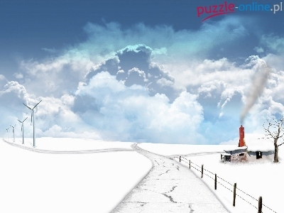 Śnieg, Chmury, Drzewo, Pole, Wiatraki , Zima, Droga, Budynek