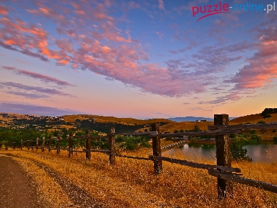 Płot, Droga, Drewniany, Chmury, Staw, Wzgórza, Niebo