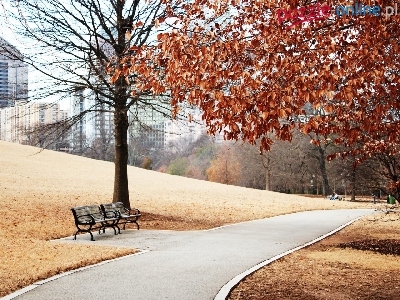 Droga, Park, Liście, Jesień, Ławka, Drzewa