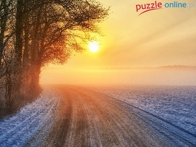 Droga, Drzewa, Zima, Zachód Słońca, Zakręt
