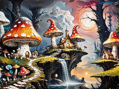 Ścieżka, Fantasy, Chmury, Las, Grzyby, Wodospad, Fantasy, Drzewa