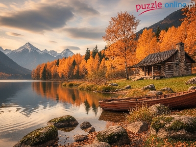 Dom, Jesień, Łódka, Góry, Kamienie, Jezioro, Drzewa