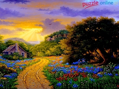 Puzzle Kwiaty, Droga, Łąka, Dom
