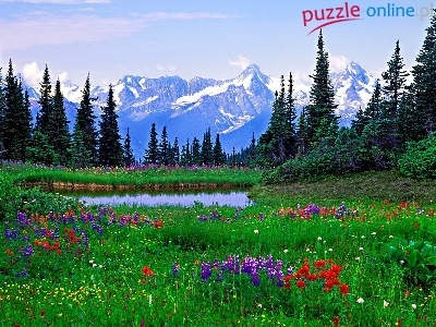 Puzzle Ośnieżone, Łąka, Kwiaty, Góry