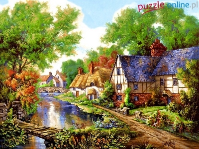 Rzeka, Dróżka, Drewniany, Mostek, Domy