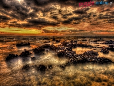 Skałki, Chmury, Zachód, Słońca, Morze