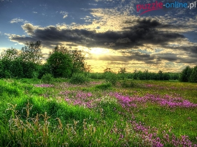Łąka, Kwiatki, Zachód, Słońca, Drzewa