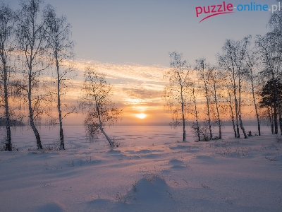 Zima, Zachód słońca, Śnieg, Brzozy, Drzewa
