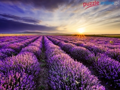 Puzzle Wschód słońca, Bułgaria, Lawenda, Chmury