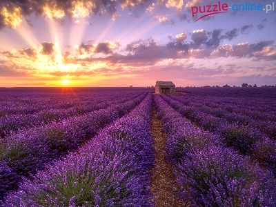 Lawenda, Dom, Pole, Zachód słońca, Chmury