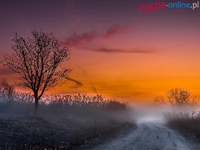 Puzzle Zachód Słońca, Droga, Pole, Mgła