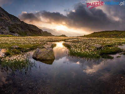 Rozlewisko, Niebo, Kwiaty, Alpy Szwajcarskie, Wełnianka wąskolistna, Góry, Rzeka, Szwajcaria, Chmury, Łąki