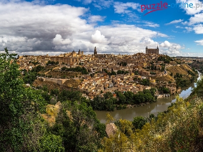 Budynki, Miasto Toledo, Chmury, Hiszpania, Rzeka Tag, Drzewa