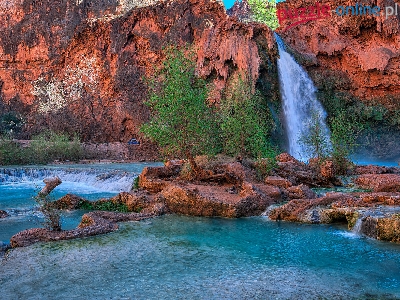 Rzeka Havasu Creek, Skały, Kanion, Park Narodowy Wielkiego Kanionu, Stany Zjednoczone, Wodospad Havasu Falls, Arizona, Drzewa
