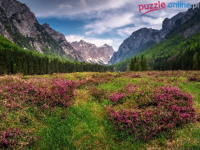 Triglavski Park Narodowy, Drzewa, Łąka, Góry Alpy Julijskie, Dolina Krma, Słowenia, Kwiaty
