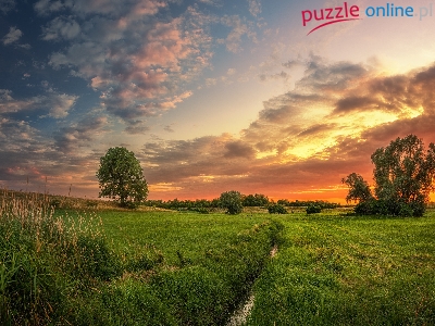 Puzzle Drzewa, Zachód słońca, Łąki, Strumyk