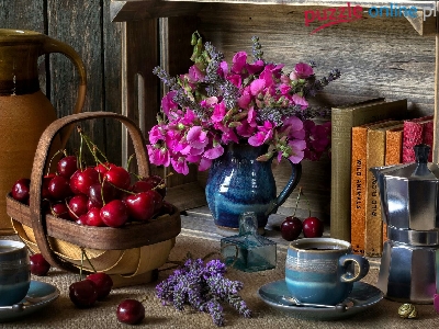 Koszyk, Wiśnie, Kwiaty, Groszek pachnący, Dzbanek, Kawa, Kompozycja, Filiżanki, Książki