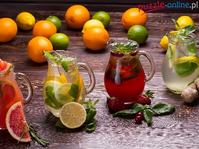 Dzbanki, Soki, Cytryny, Truskawki, Owoce, Limonki, Kompozycja, Pomarańcze, Imbir