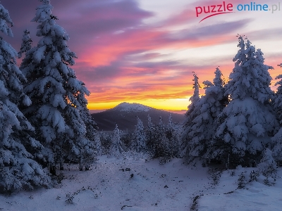 Ośnieżone, Wschód słońca, Zima, Góry, Drzewa