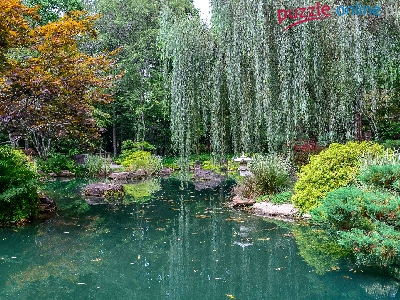 Drzewa, Krzewy, Ogród, Staw, Wierzba