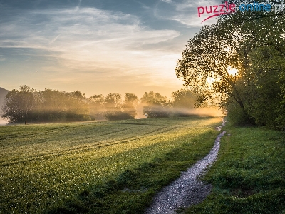 Drzewa, Mgła, Pole, Droga, Wschód słońca