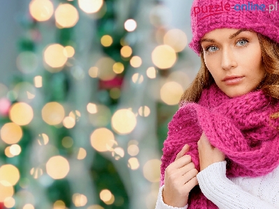 Szal, Różowa, Rozmycie, Kobieta, Czapka, Światełka
