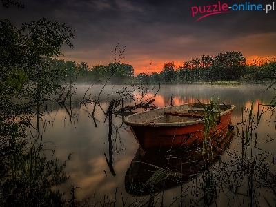 Mgła, Łódka, Trawy, Jezioro, Zachód słońca, Drzewa