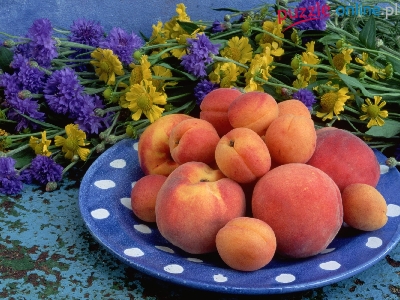 Żółte, Kwiaty, Brzoskwinie, Talerzyk, Fioletowe