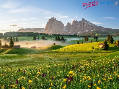 Domy, Góry Sassolungo, Kwiaty, Dolina Val Gardena, Drzewa, Dolomity, Mgła, Płaskowyż Seiser Alm, Włochy, Łąka