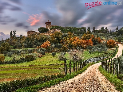 Wzgórze, Włochy, Hotel Massaini, Drzewa, Domy, Droga, Cyprysy, Toskania