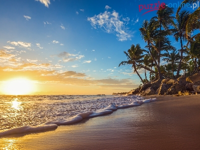 Wschód słońca, Palmy, Morze, Plaża, Skały