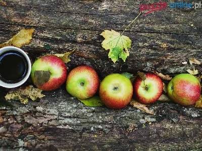 Jesienne, Deski, Kawa, Jabłka, Liście