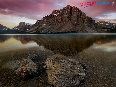 Góry, Odbicie, Kanada, Góra Crowfoot Mountain, Prowincja Alberta, Park Narodowy Banff, Jezioro Bow Lake, Kamienie