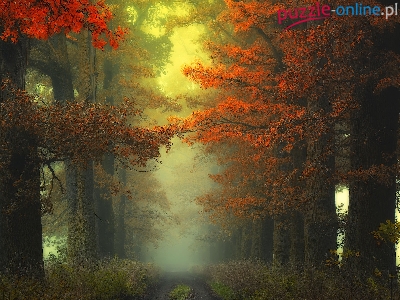 Jesień, Droga, Las, Drzewa, Mgła