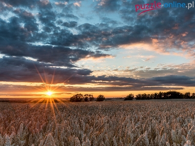 Drzewa, Promienie słońca, Pole, Zboże, Chmury
