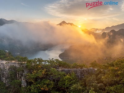 Jezioro, Korea Południowa, Roślinność, Góry, Chmury, Wschód słońca, Skały Mgła, Oksunbong