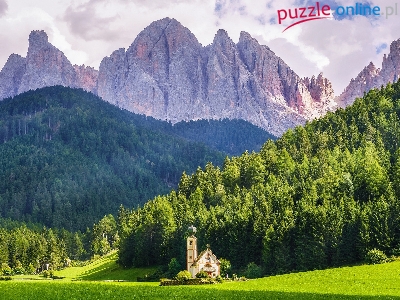 Dolomity, Kościół św. Jana, Lasy, Dolina Val di Funes, Góry, Włochy