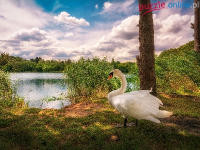 Puzzle Drzewa, Jezioro, Łabędź, Chmury