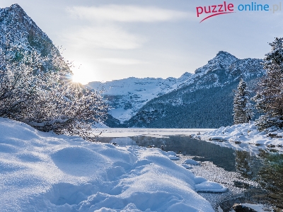 Park Narodowy Banff, Alberta, Louise Lake, Promienie słońca, Zima, Jezioro, Kanada, Góry Skaliste, Drzewa
