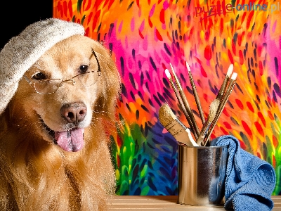 Golden retriever, Obraz, Kubek, Czapka, Pędzelki, Pies, Okulary, Szmatka