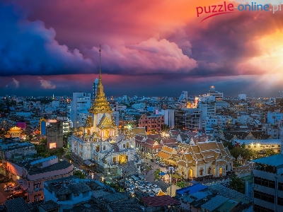 Puzzle Tajlandia, Świątynia buddyjska Wat Trimitr, Bangkok, Zdjęcie miasta
