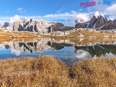 Południowy Tyrol, Jezioro, Odbicie, Góry Alpy, Włochy, Dolomity, Trawa