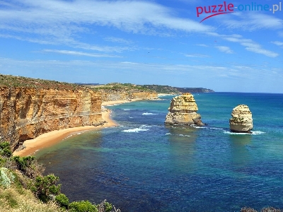 Kolumny wapienne, Klif, Plaża, Cieśnina Bassa, Morze, Australia, Skały, Ocean, Park Narodowy Port Campbell, Dwunastu Apostołów, Niebo
