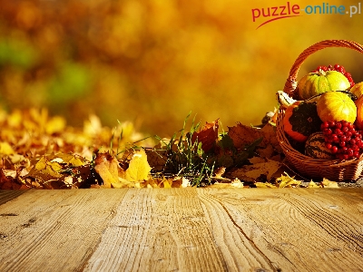 Jarzębina, Koszyk, Deski, Jesień, Dynie, Liście