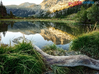 Jezioro, Konar, Odbicie, Powalony, Góry, Drzewa, Trawa
